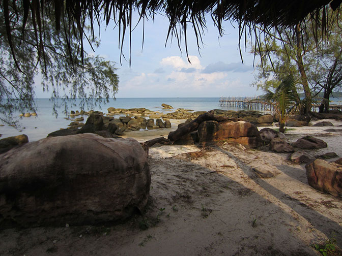 We didn’t realize that the boats to Koh Rong ($15/2.5 hrs) are associated with the guesthouses on the island and they take you to that guesthouse only, not a central pier like we assumed. So book the boat with the guesthouse that you want to stay at. We ended up at Song Saar Bungalows. For $20/night we had a rustic bungalow with a lovely view and a couple of visitors.