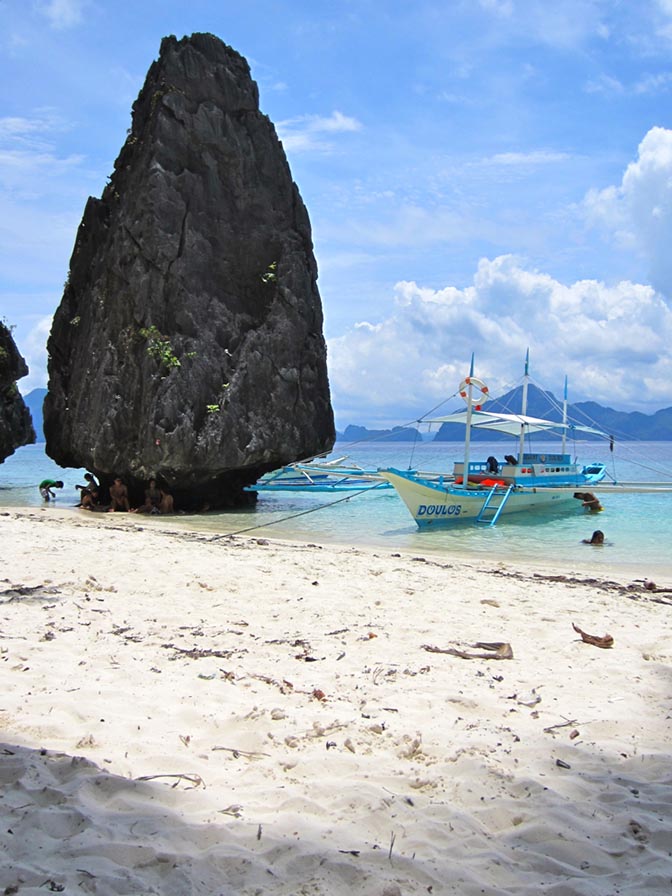 We went to the beach, had some lunch, swam in the sea, drank some beers, booked our island hopping tour for tomorrow, and headed back home for a shower. When we got back to our cottage, we looked over and saw a pig lying prostrate on the table. The lady pointed and said, “Wild pig! The rope went around his neck and he died.” Apparently, they bought the pig at the market that morning and then killed it by accident (some would call it murder), and now they intended to eat it. We spent the next few hours playing Scrabble while watching them prepare the pig, stab a giant pole through his middle, and then hand rotisserie him. The unlucky pig.We booked our island hopping tour with Servant Tours. We chose Tour A (the highlights of El Nido) and talked the lady down to P600/$14 from P700, but I’m pretty sure we could have got it for less. She didn’t even have to think about letting us have it for P600. If you are really hoping to save money and aren’t on a tight schedule, try going down to the waterfront area with your daypack ready at around 8:30AM. Any tours that aren’t sold out will probably be desperate to fill the empty seats before the ship sets out at 9:00. There would be a maximum of ten people on our tour. It really doesn’t matter how many people (other than being overcrowded on the boat) as there are lots of tourists at all the sights anyway.