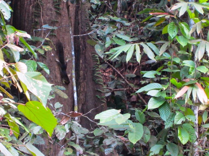 It would be beautiful to go in August/September to see the orchids in bloom. After the garden, we set out on one of the many trails through the forest. We walked to Hornbill Tower (where we saw some trogons but no hornbills), along Kingfisher Trail (one kingfisher and a giant squirrel spotted) to Woodpecker Avenue (woodpeckers heard but not seen), and then finally to the canopy walkway. We saw a hornbill flying overhead, and glimpsed a plain pygmy squirrel darting amongst the trees (endemic to Borneo, one of the smallest squirrels in the world, and adorable!).