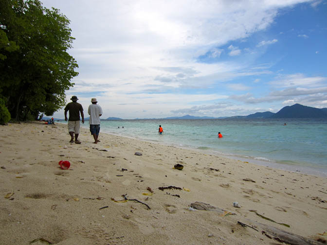 We came ashore on a sandbar that stretched out from the island into the perfect turquoise water. As our feet touched land again, Jainan warned us that the “sea gypsies” would rob us and we should pay him now. The “sea gypsies”, as the local Malaysians refer them to, are an indigenous ethnic group, who live a nomadic seafaring lifestyle, known formally as the Bajau. Not knowing who to trust more, we agreed that we would pay him the rest of his money as soon as we were safely back on the mainland. We walked the length of the island and settled in a shady spot and snorkelled. The Bajau kept making the rounds, asking the tourists for money. The children would plonk themselves down facing you, hold out their hands, and wait for money. A small naked boy and his friend sat next to me and started singing. It was the worst singing I’ve ever heard. I was sure they had learned that when they sat by someone and sang loudly and badly enough, they would be paid to go away. Jainan came striding down the beach, stick in hand, and chased them away; narrowly avoiding hitting the naked one. It was the first of many unorthodox moves made by Jainan that day. Later, he lit a fire on the island (a protected national park) just to “burn stuff”, and then almost ran me down in his speed boat while I was face down, blissfully unaware, in the cordoned off snorkelling area.